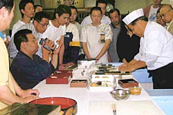 講師としてお招きしたのは京都府寿司衛生組合技術委員長の花登一彦氏(京都府優秀技能者ー現代の名工受賞)、「寿友会」技術委員長の下口真樹氏(京都府青年優秀技能者奨励賞-明日の名工受賞)、元「寿友会」会長の橋本優氏の3氏。今回の講習会では、細工すしは切れ端など余り物を利用し、細工巻は、まず各パーツをきちんと作ってから仕上げにかかることなどを教わった。